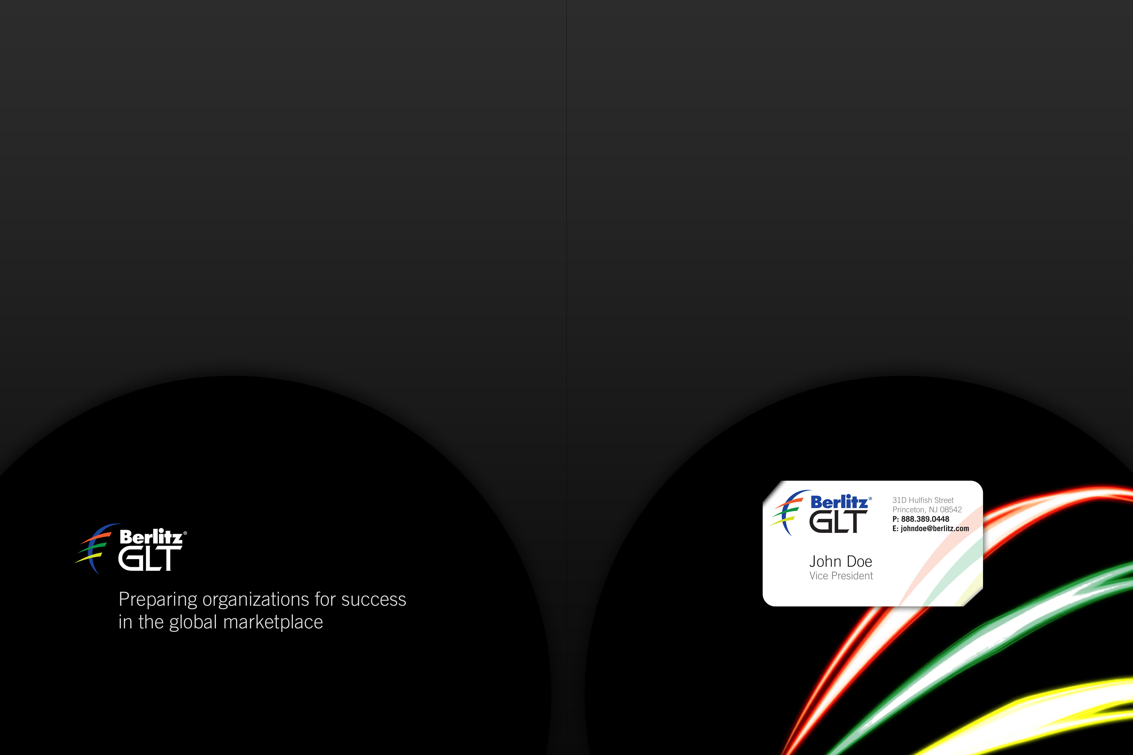 Branding materials (logo, brochure, pocket folder) for Berlitz GLT, Global Leadership Training. Branding to advertise their worldwide training program. Produced at JK Design.