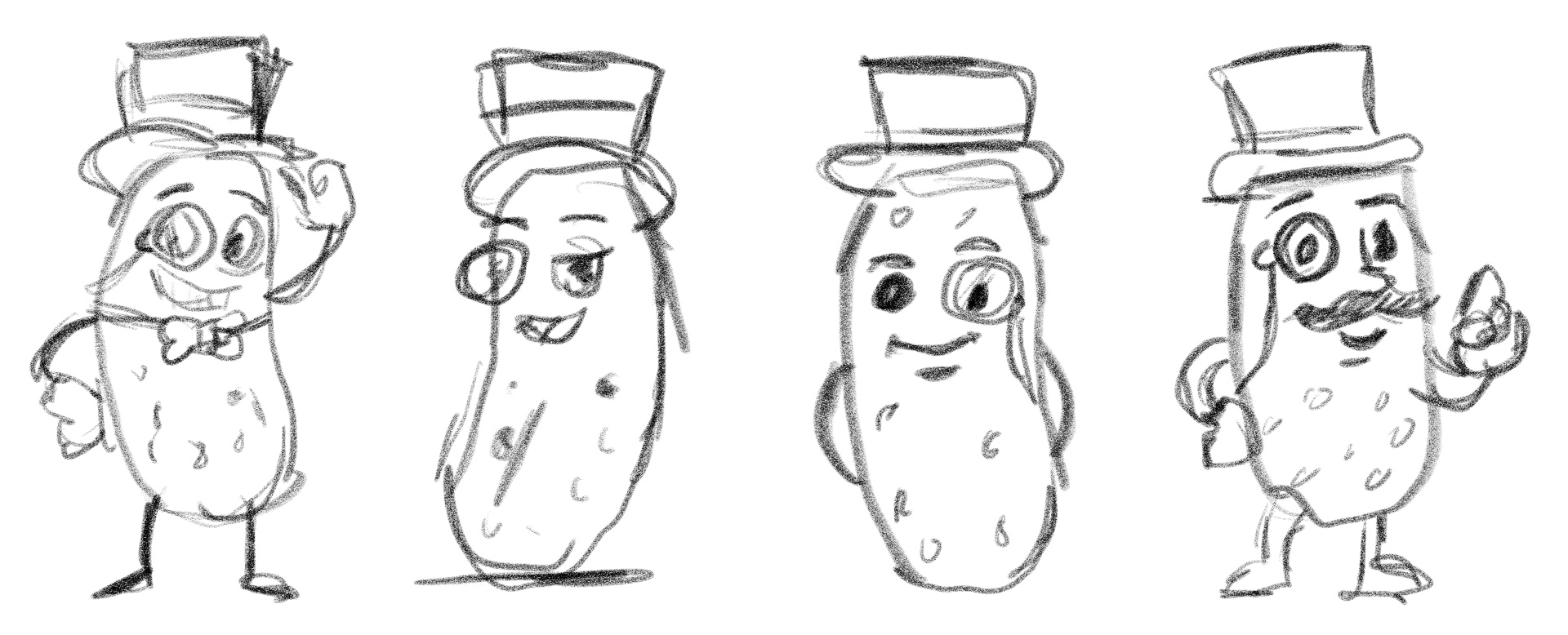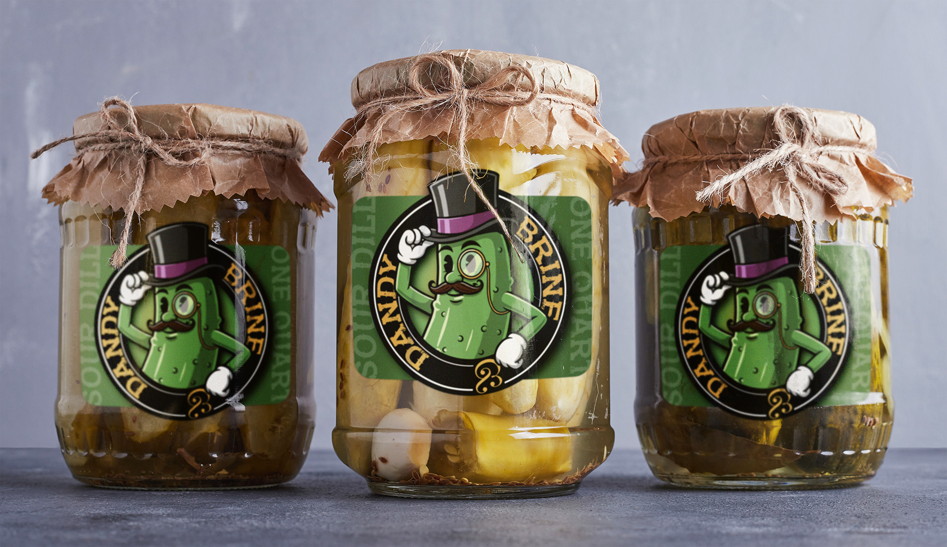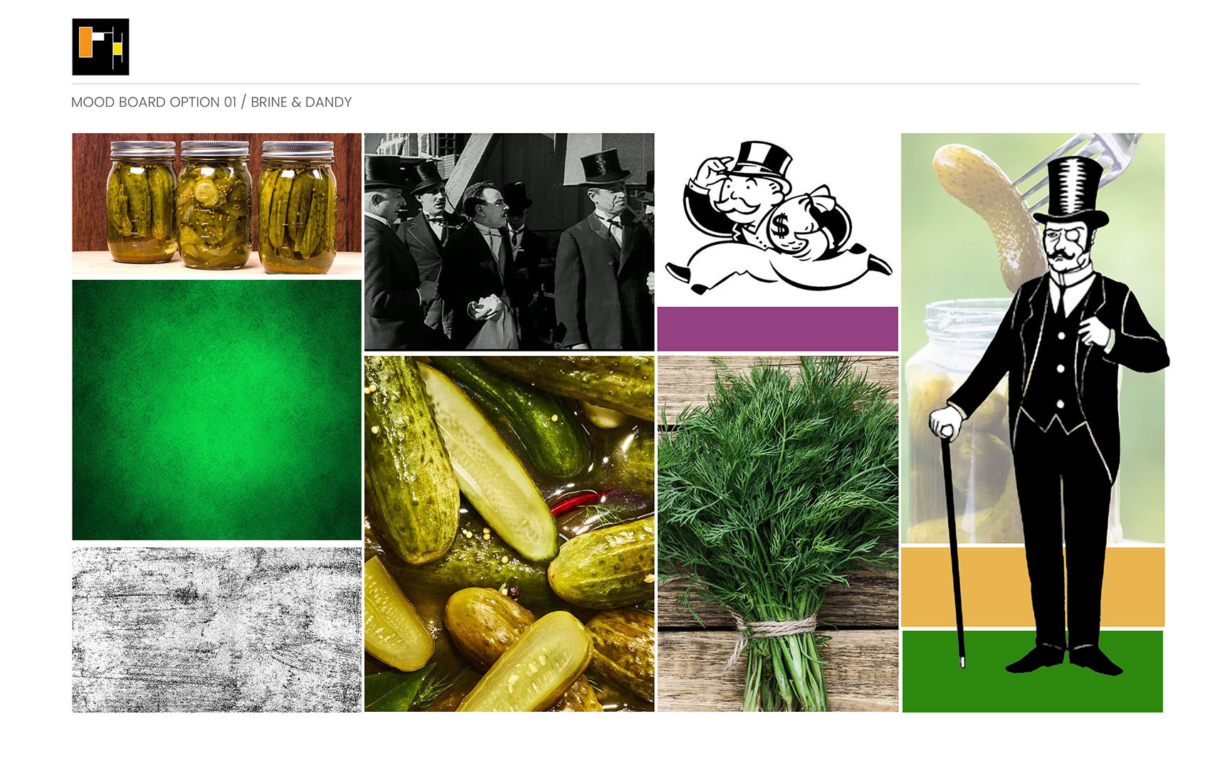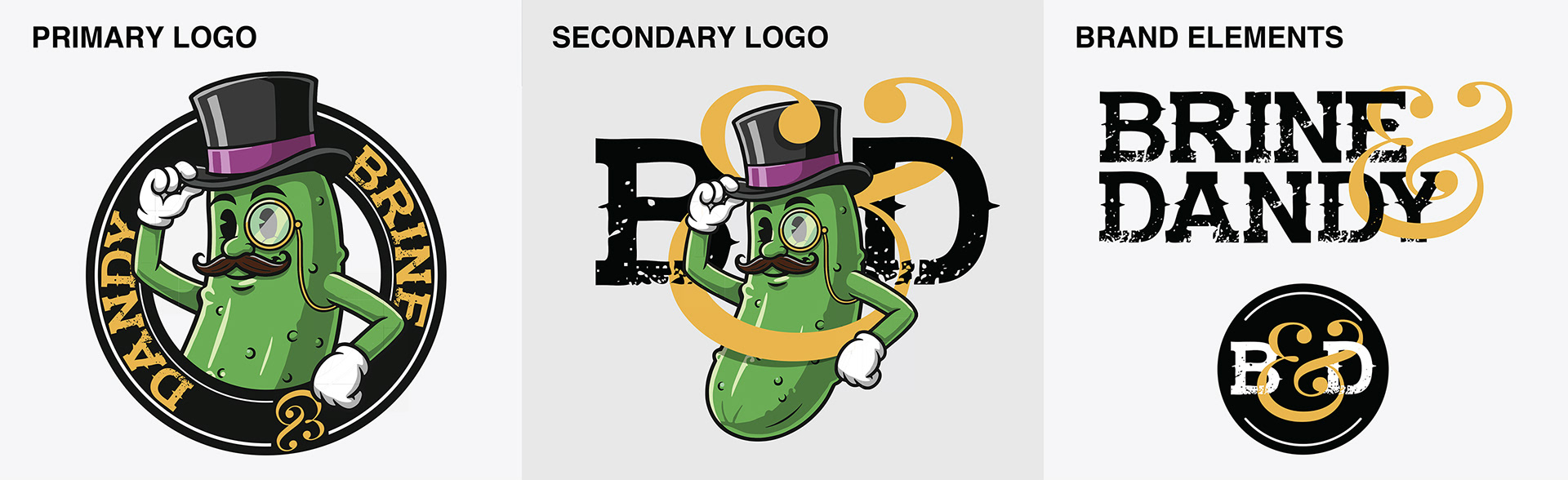 The logo features a dapper and dandy pickle mascot with fancy accessories, designed to work across packaging, digital, and merchandise.