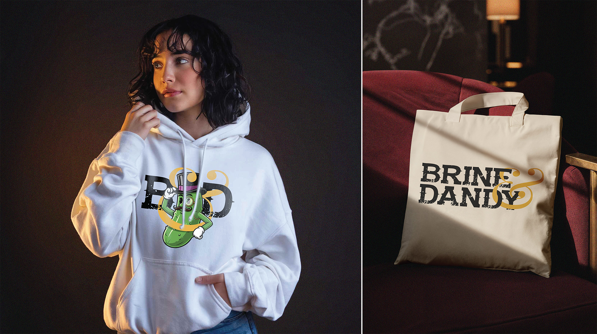 Merchandise mockups include branded hoodies, tote bags, and jar labels that extend the brand into lifestyle territory, showing how Brine & Dandy can live beyond the jar and build a loyal community.